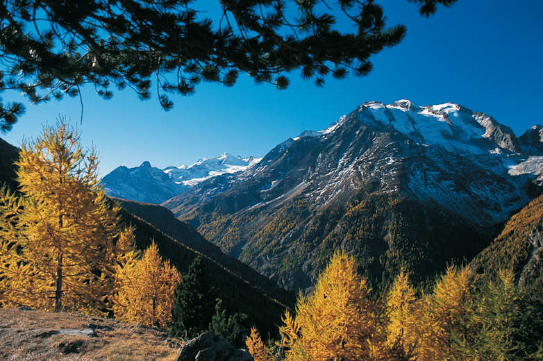 Herbststimmung am Gsponer Höhenweg; gegenüber das Balfrin-Massiv. Foto: Mark Zahel