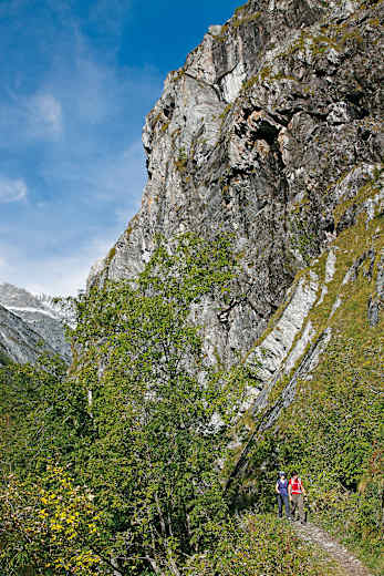 In Eggen, 1.049 m, wählen wir den ersten Weg oberhalb der Rechtskehre (dort Parkplatz) und schließen in Kürze zur Gorperi-Suone auf. Man geht den Seitengraben des Teiffebachs aus und wandert nun entlang der Wasserleite schnurstracks ins Baltschiedertal hinein. Das Trassee schmiegt sich wunderbar an die Steilflanke – im Wege stehende Felsen werden einfach mit Tunnels durchbrochen, einmal gibt es für Mutige auch eine gesicherte Traverse außen herum. Nach einer ganzen Weile endet die Suone im Talgrund (bzw. wird hier gefasst).