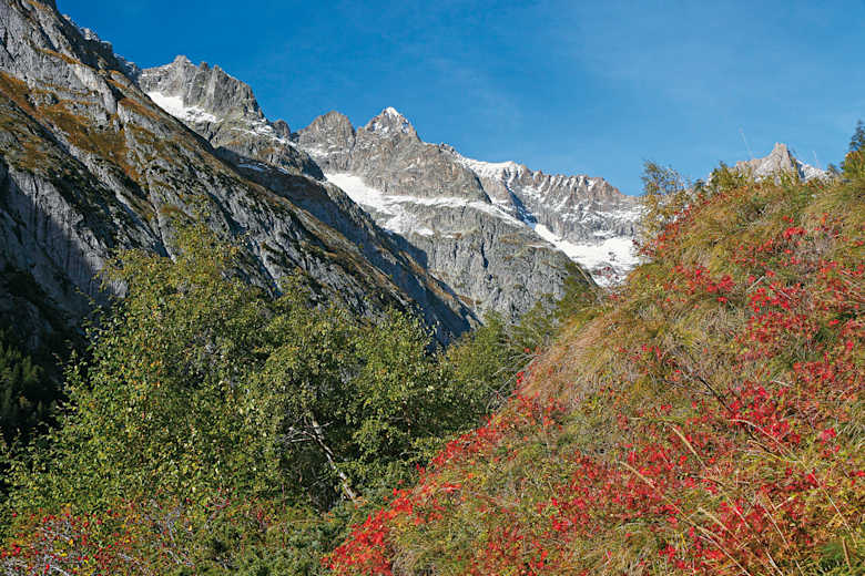 Impressionen von einer überkommenen Bergbauernkultur in den Berner Alpen: Vom Bergdorf Eggen, das auf 1.000 Metern selbst schon eine prächtige Lage über dem Rhonetal innehat, bietet sich eine Rundwanderung auf abwechslungsreichen Wegen an. Den Beginn macht die mustergültig angelegte Gorperi-Suone, die früher zur Bewässerung existenziell war. Sie leitet hinein ins Baltschiedertal, wo die Abgeschiedenheit sofort greifbar wird, obwohl wir noch nicht einmal sehr weit in diesen Gebirgswinkel vordringen.