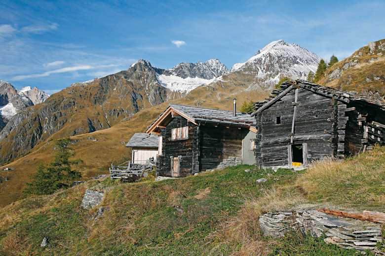 Wir wechseln an dieser Stelle die Bachseite, treffen auf die Route von Ausserberg und laufen noch ein Stück weit taleinwärts bis Ze Steinu, 1.287 m, wo man wieder eine Brücke nach rechts überschreitet. Unmittelbar rechts neben den Hütten setzt der dürftig bezeichnete Alpweg nach Eril an. Er schraubt sich anfangs nur schmal ausgetreten, später jedoch komfortabler am Steilhang empor, wobei das Furggbachtobel stets zur Rechten bleibt. Eril (Erl), 1.780 m, empfängt uns als pittoreskes, sonnenverwöhntes Hüttenensemble wie aus einer vergangenen Zeit.