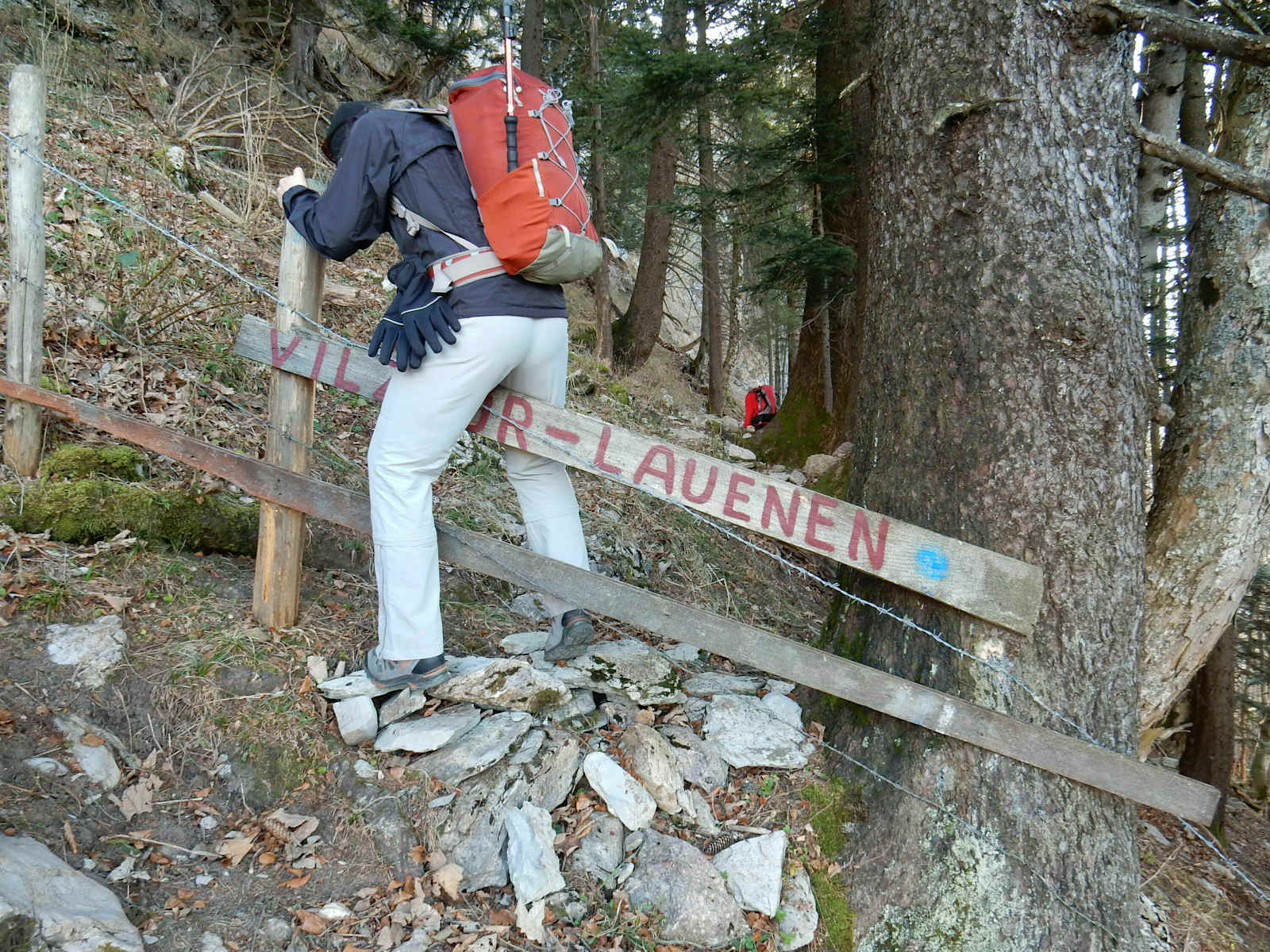 Ein ziemlich deutlicher Pfad würde nun direkt hoch führen auf die darüber liegenden Wiesenhänge, man benutzt diesen jedoch erst später für den Abstieg, und hält stattdessen nun die Höhe und quert in südsüdöstlicher Richtung hinüber zum Waldrand. Noch vor dem Wald weist eine schwache weissblaue Markierung auf den empfehlenswerten Steig hin; der Einstieg erfordert etwas Akrobatik und ist ebenfalls markiert.