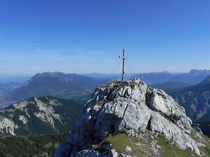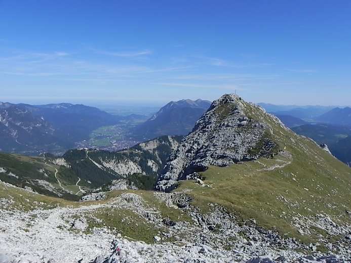 Der Bernadeinkopf steht etwas im Schatten der mächtigen Alpspitze. Zu Unrecht! Der Anstieg vom Kreuzeck über die Schöngänge ist spannend, die Aussicht auf das Tal traumhaft und der Abstieg über den Stuibensee traumhaft schön. Die Anreise erfolgt idealerweise mit öffentlichen Verkehrsmitteln.