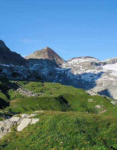 Die anschliessend meist grasbezogene Flanke führt unschwierig weiter. Spuren sind mehrere auszumachen, es gilt grundsätzlich die Richtung Geröllfeld unterhalb des Alpler Tors einzuhalten.