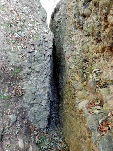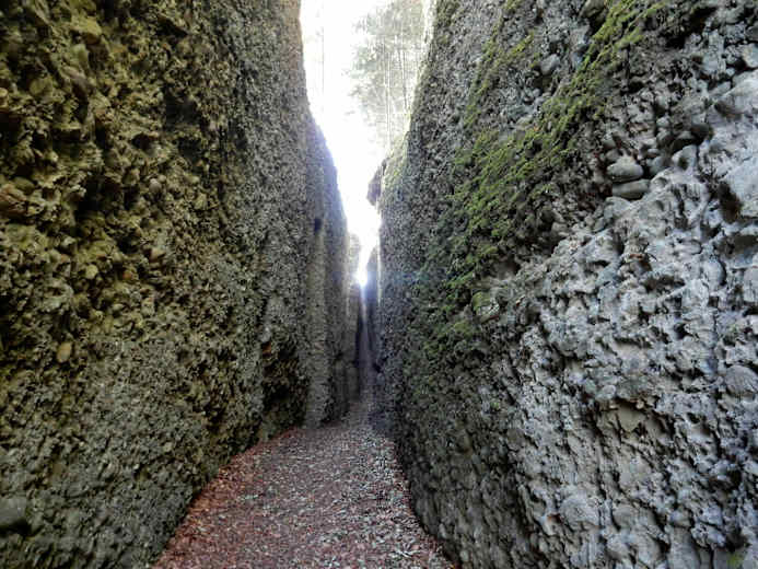 Schnell befindet man sich beim Eingang in den Bachtelspalt, der Einzelbaum im Nagelfluhriss weist den Weg. Immer höher werden zu beiden Seiten die Wände des Nagelfluh und immer enger der Durchgang, so dass man sich schließlich schmal machen muss, um hindurch zu kommen.
