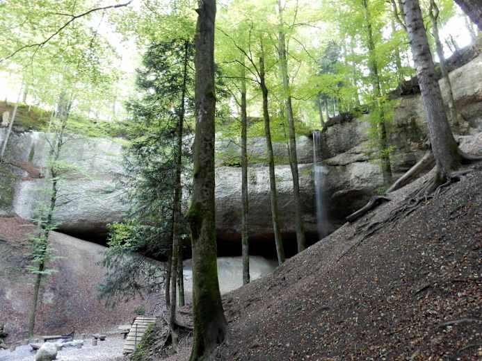 Vom Bahnhof Gibswil geht man noch wenige 100 m der Strasse entlang bis der Wanderweg in den Wald abbiegt. Schnell öffnet sich hier das felsige Rund des Wissengubels: eine mächtige, sehr beeindruckende Felswand mit einer grossen Unterhöhlung.