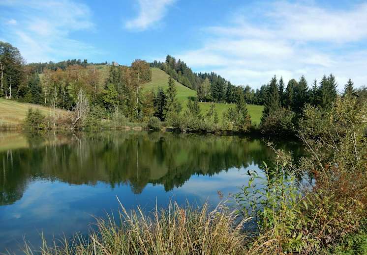 Durch das lichte Wäldchen Wässerholz hindurch erreicht man wieder offenes Landwirtschaftsgebiet. Über Blegi erreicht man erst flach, dann mässig ansteigend den grossen Hof Hintersennenberg. Ein kurzer Abstieg in das kleine Tal des Huebbaches und wenige Meter Wiederanstieg führen zum idyllischen, unter Naturschutz stehendem Bachtelweiher.