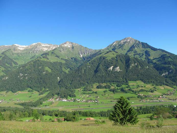 Nach wenigen Metern auf der Strasse geht es bald wieder auf die Alpweide hinaus und dann hoch zur Hütte auf Geerizube. Etwas steiler führt der hier abschnittweise kaum erkennbare Weg hoch bis er kurz vor Chüeweid (1.468 m) flacher wird und einen schönen Weitblick zur Niesenkette eröffnet. Der weitere Weg hinauf zur nicht bewirtschafteten Furggihütte führt durch schönes Alpgelände und beschert weitere schöne Ausblicke auf Niesen und Nachbargipfel.