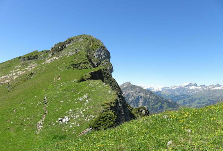 Wenig später erreicht man die beinahe flache Alp Ober Geerene. Nachdem man kurz die Aussicht genossen hat, quert man diese zum wenig später wiederum steilen Anstieg zum NNE-Grat des Gipfelzieles.