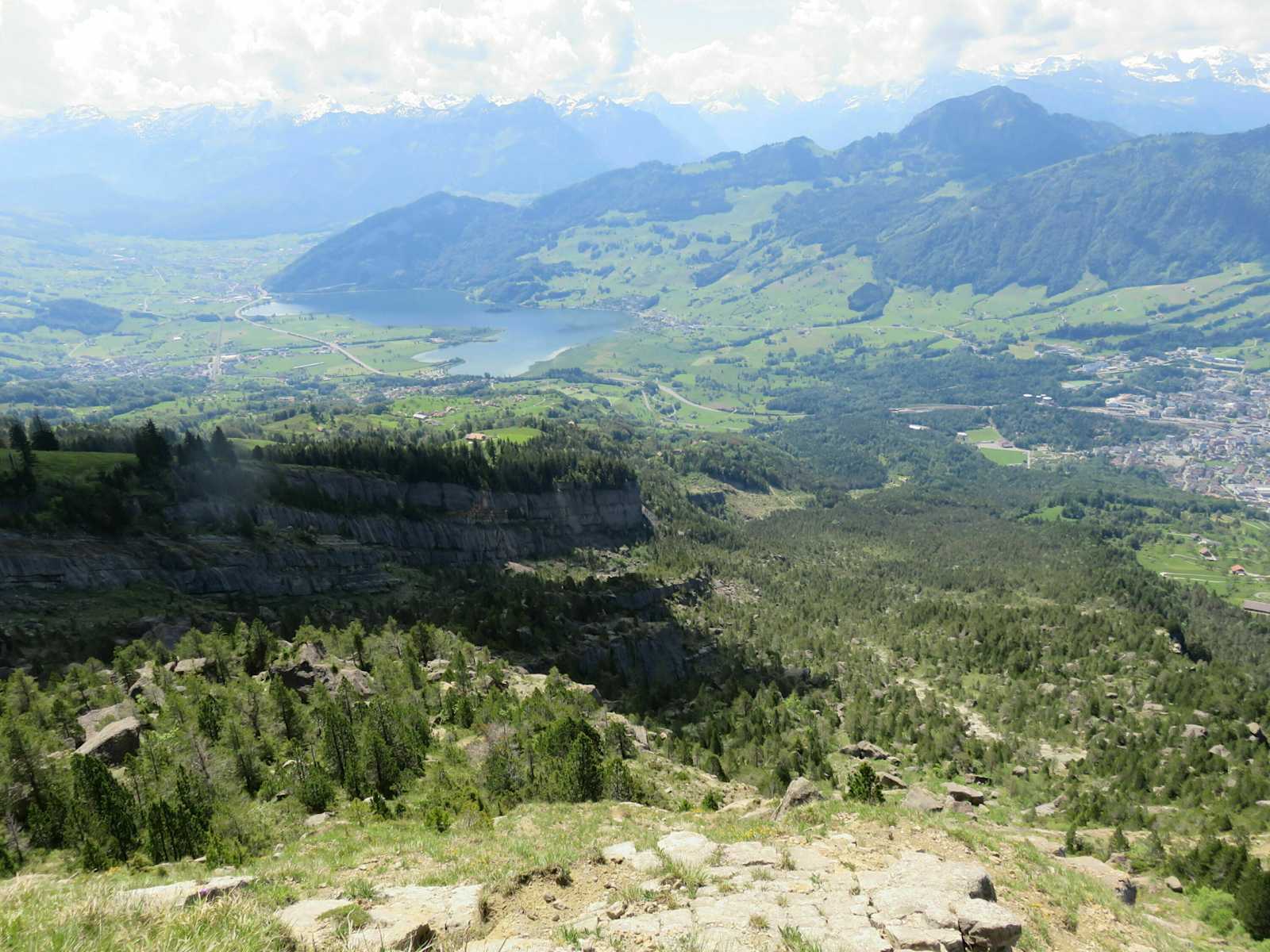 Vorbei an den speziellen Geländeformationen erreicht man über einige attraktive Kraxelstellen, abschnittweise an der Gratkante aufwärts steigend, zuletzt einen waldbesetzten Abschnitt. Dann wieder im Freien auf der Wiese öffnet sich die Aussicht zu einem überraschenden Tiefblick auf den Zugersee.