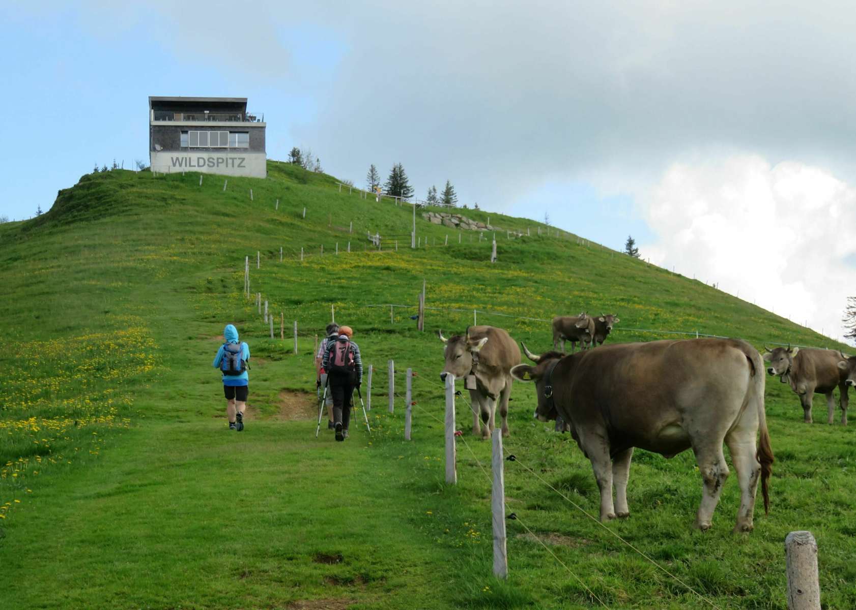 Entlang der Abbruchkante des Bergsturzes gelangt man zum nur wenige Meter höheren Gnipen (1.568 m) . Von hier folgt ein leichter Abstieg und ein kurzer Wiederanstieg durch lauschigen Wald und bis zu dessen Ende. Über offene Weidefläche gelangt man schließlich zum Gipfel des Wildspitz (1.580 m) und kann beim etwas tiefer gelegenen Berghotel Wildspitz (1.568 m) eine wohlverdiente Rast einlegen.