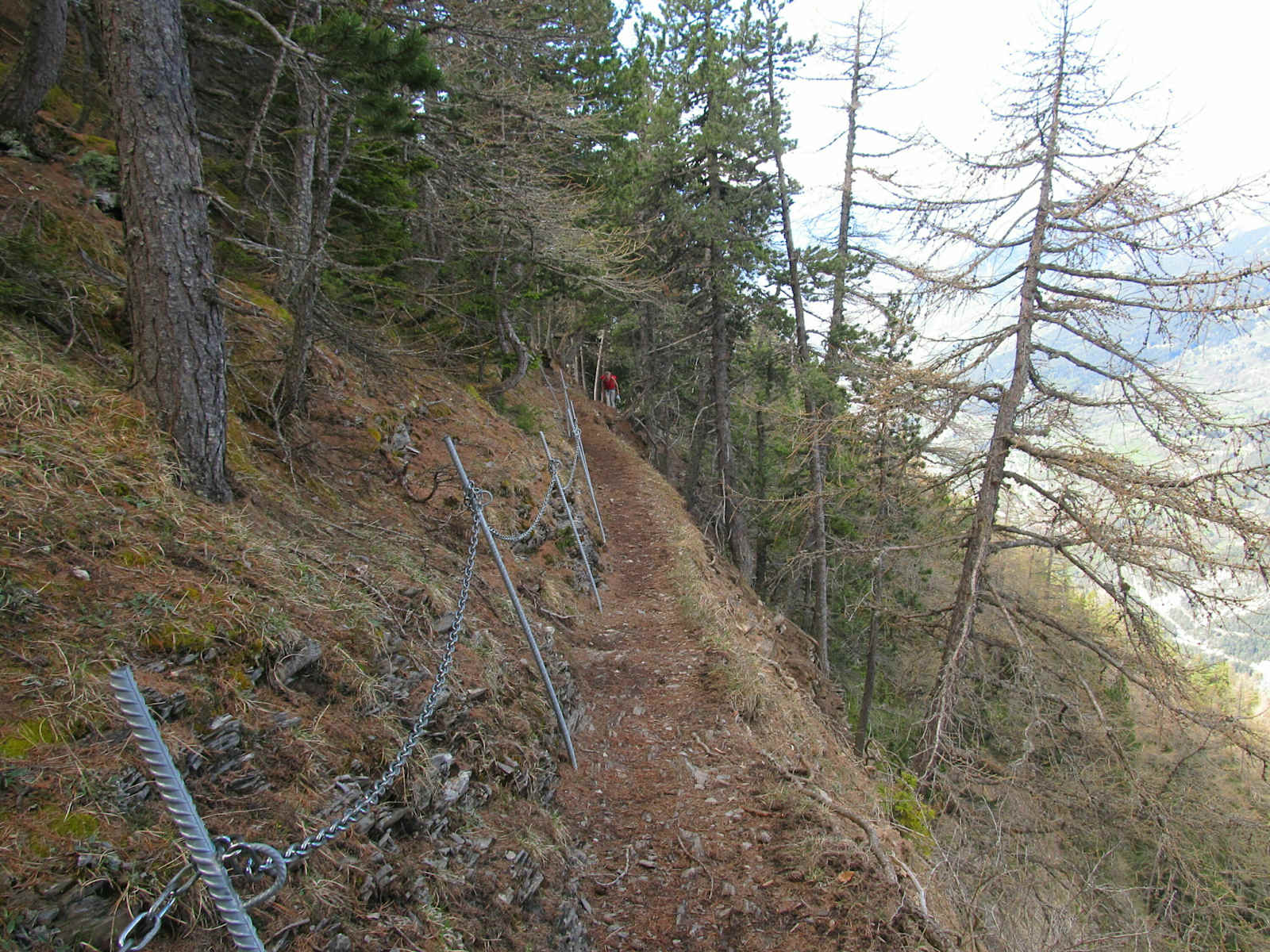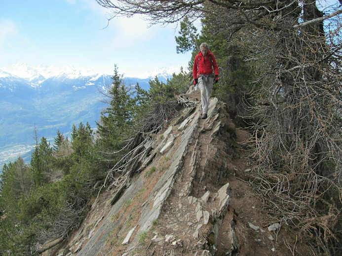 Wenig später erreicht man die seilgesicherte Südflanke und überquert sodann eine kleine Brücke, bevor man oberhalb des Lärchenwaldes in ein paar Spitzkehren wieder auf den Grat gelangt. Stets den gut sichtbaren Wegweisern in einem Auf und Ab folgend, erreicht man schliesslich flacheres Gelände, welches südostseitig - gegen La Loué - mit immensen, eisernen Lawinenverbauungen versehen ist.