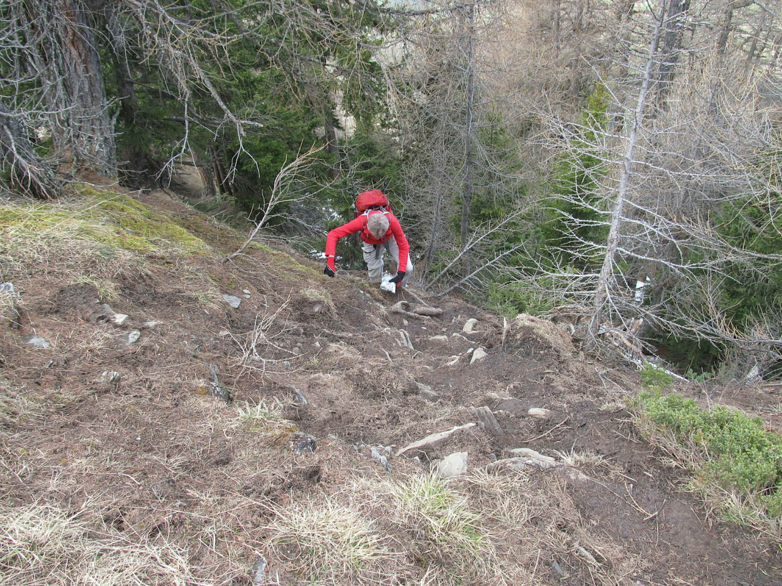An dieser Stelle beginnt der lange Anstieg, welcher stets dem Gratverlauf folgt: erst steil durch den Wald, dann auf einer blumenreichen Wiese bis zu einer Straßenkehre. Die hierbei vorbeiziehenden Abbrüche zum Tal der Morge sind beeindruckend.