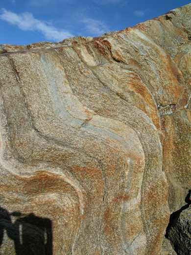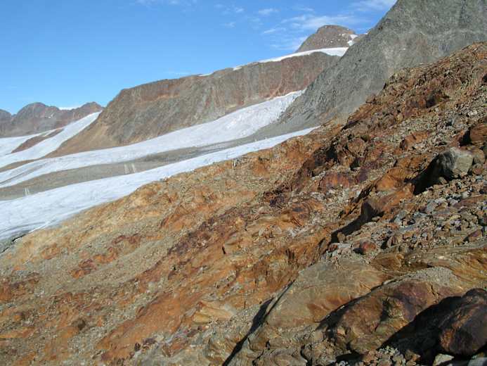 Unterhalb der Seile der Teufelseggbahn hindurch führt der Weg - wunderbar saniert - durch etwas felsigeres Gelände in das nächste Tal unterhalb des „Hinteren Eises“. In einem weiten Rechtsbogen auf dem mit Steinplatten ausgelegten Weg um eine Geländekante, von der man nun erstmals die Hütte sieht. Beeindruckend sind die vom Gletscher glatt geschliffenen, mehrfarbigen Felsen.