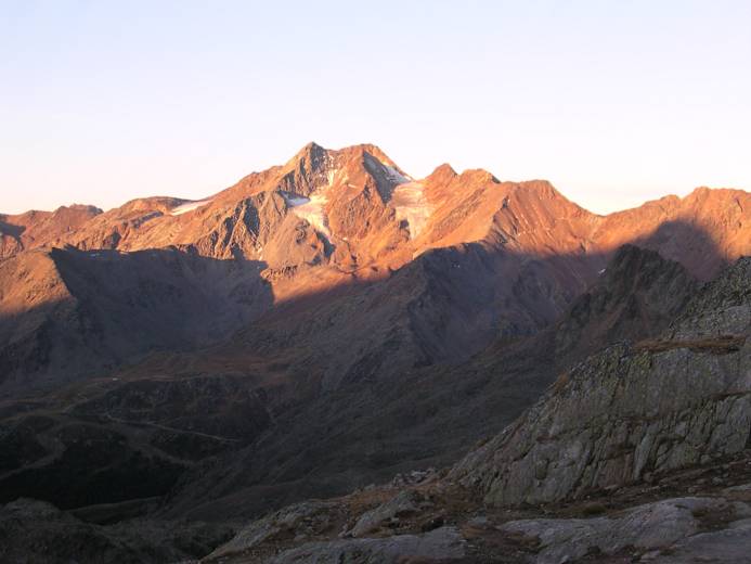 Wunderschönes altes Bauernhaus im Schnalstal Foto: Ch. Schwann Durch das Oberbergtal plätschert ein kleiner Bach Foto: Ch. Schwann Gletscherschigebiet Schnalstal Foto: Ch. Schwann Vom Gletscher geschliffener Fels Foto: Ch. Schwann Abendlicht auf den Gipfeln der Ötztaler Alpen Foto: Ch. Schwann