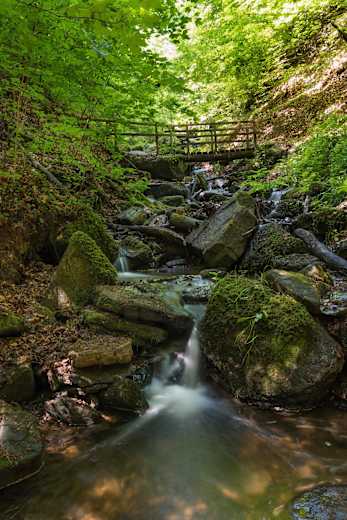 Von der Bogenstraße führt eine Holzbrücke über den Eisenbach und am Naturdenkmal Eissee-Reisenwaldweg vorbei bis zur Weißen Brücke.