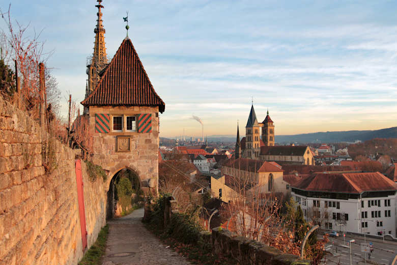 Vom Bahnhof in Esslingen am Neckar wandert man durch die Bahnhofstraße bis zum Schelztor. Dort geht es vorbei bis man zum Marktplatz gelangt.
