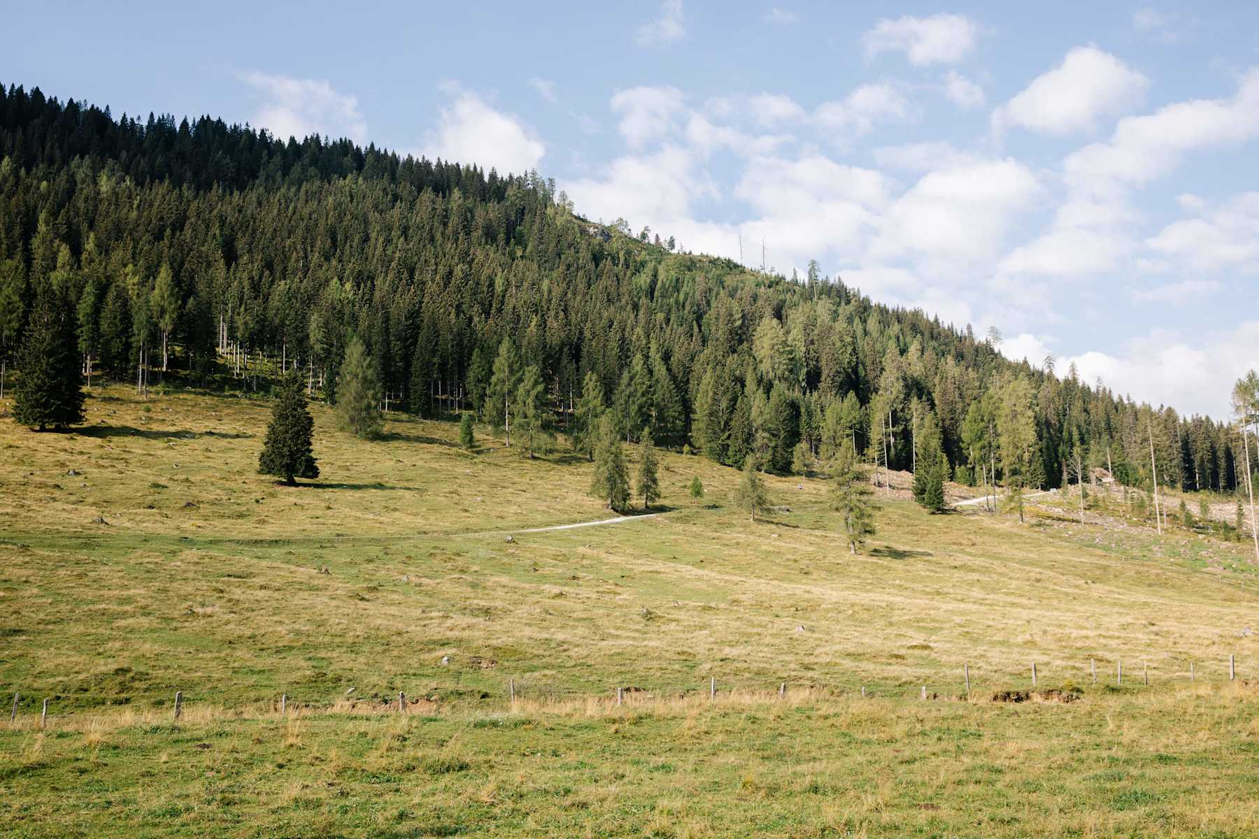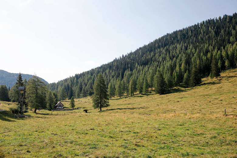 Durch lichten Lärchenwald und Latschen folgt man nun dem Verlauf des Karnischen Höhenweges 403, der auch einem Teil der Via Alpina (Roter Weg von Triest bis Monaco) entspricht, abwärts bis zur Garnitzenalm auf 1.640 m.