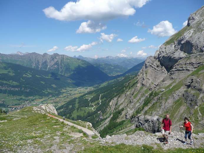Den Weg herab nach Gsteig (1.184 m) kann man in ca. 2 h zu Fuss oder bequem mit der Luftseilbahn bewältigen. Von der Talstation sind es 30 Minuten bis nach Gsteig.
