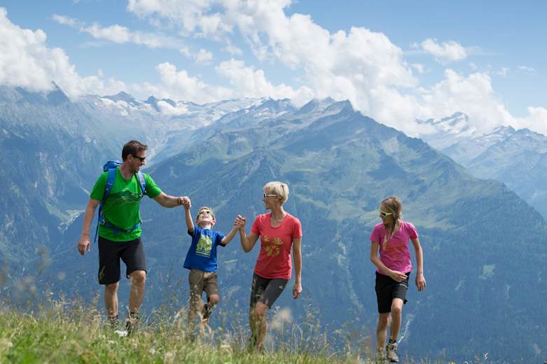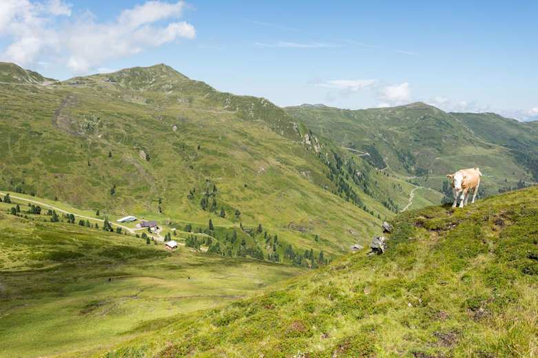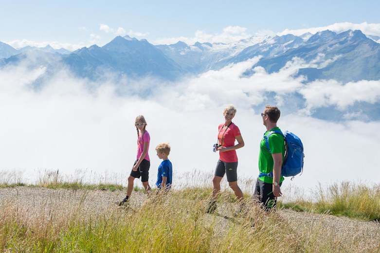 Sehr beliebte und aussichtsreiche Familienwanderung im Herzen der Ferienregion Nationalpark Hohe Tauern in den Kitzbüheler Alpen in Salzburg. Ausgehend von der Bergstation der Wildkogelbahn führt dieses Wandervergnügen über Almwege bergab zur Baumgartenalm auf 1.402 m. Immer wieder hat man eine fantastische Aussicht auf die gesamte Wildkogel Region.