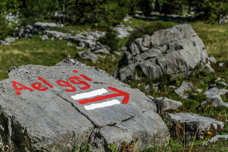 Wandermarkierung in Richtung Aelggialp Foto: Obwalden Tourismus - Nicolas Glauser