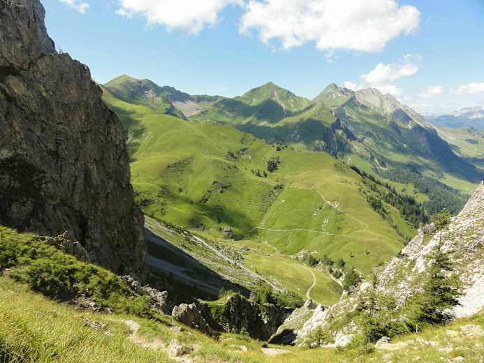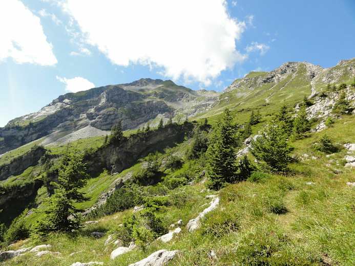 Nach wenigen Minuten erreicht man eine Weggabelung und steigt linker Hand in sanften Gefälle Richtung Sandboden ab. Über Vorder und Hinter Brosmatt führt der Weg zur Fluonalp.