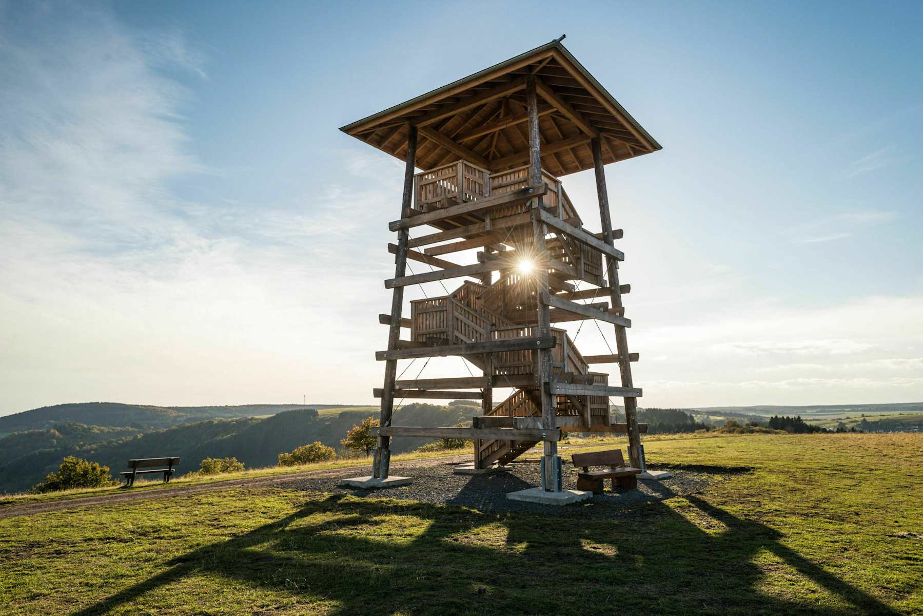 Die 2. Etappe des VulkaMaar-Pfades beginnt in Meerfeld im Meerfelder Maar. Das Maarfelder Maar ist der größte Maarkessel der Eifel, der sich vor rund 40.000 Jahren durch einen Vulkanausbruch gebildet hat. An der höchsten Kratererhebung steht der Aussichtsturm „Landesblick“, der einen wunderbaren Rundblick über die westliche Eifel bietet.
