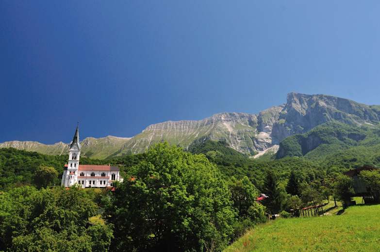 Die Etappe startet im Zentrum von Bovec und führt an der Kirche St. Ulrich vorbei hinauf in das Dorf Plužna. Von hier ist es nicht weit bis zum Wasserfall Virje und einem kleinen See.