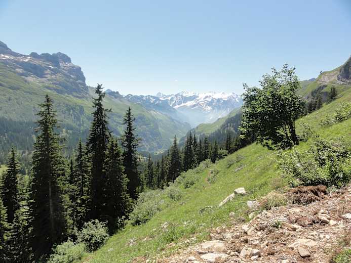 Von Langis geht es auf dieser 2. Etappe des Obwaldner Höhenweges weiter. Waldreich ist das Grenzgebiet zwischen den beiden Kantonen Obwalden und Luzern; großartig die Aussicht auf die Voralpengipfel bis zu den Viertausendern der Berner Berge.