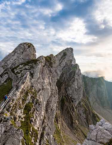 Der markierte Weg wird nun zu einem heiklen und ausgesetzten, aber mit Ketten gut gesicherten Aufstieg zum Augstmatthorn (2.137 m). Der höchste Punkt der Tour ist erreicht.