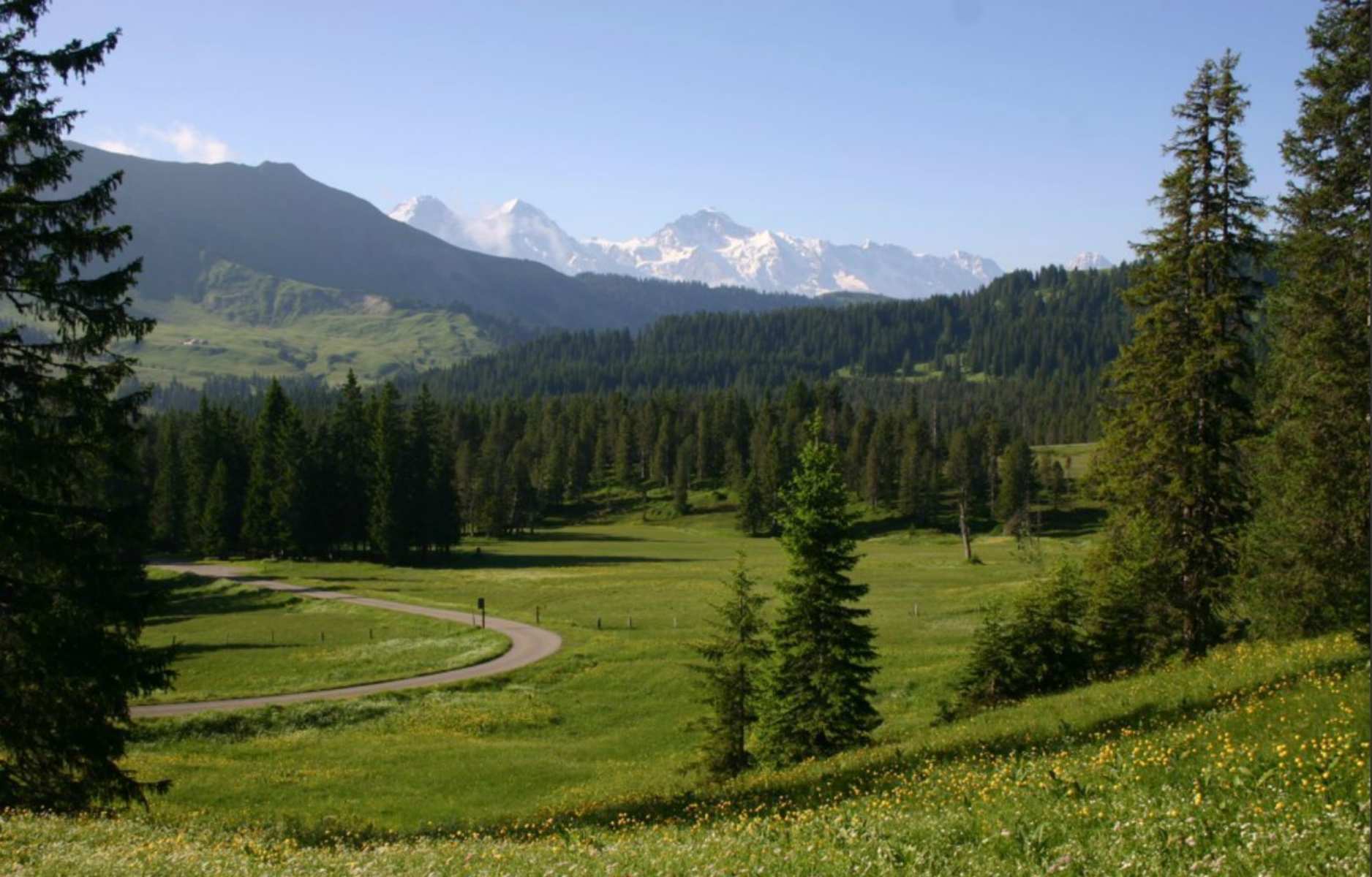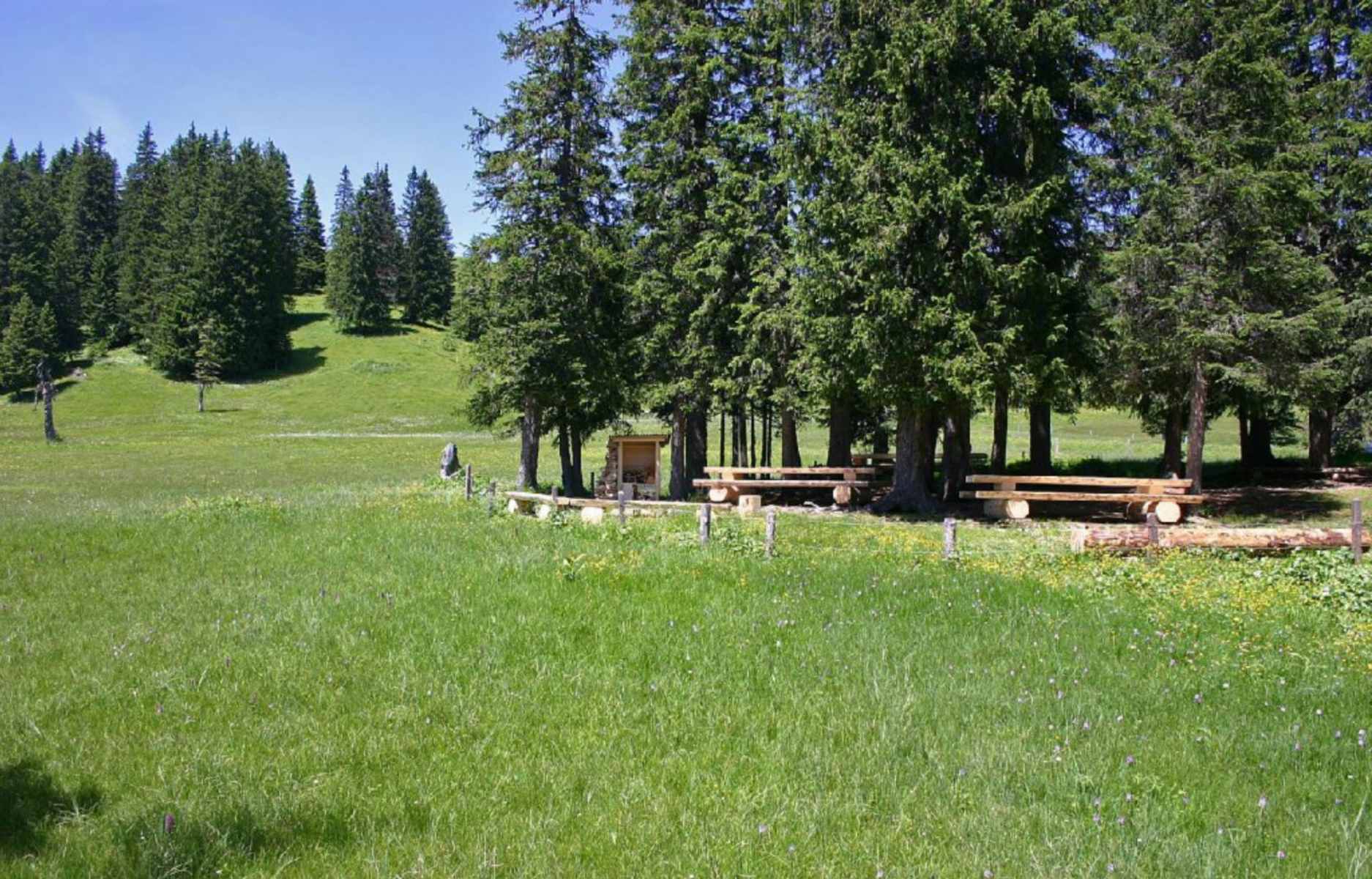 Eine Brätelstelle und Picknickplätze laden inmitten der puren Natur zum Verweilen ein, die Aussicht auf das Dreigestirn Eiger, Mönch und Jungfrau eröffnet sich ungetrübt über den Wiesen.