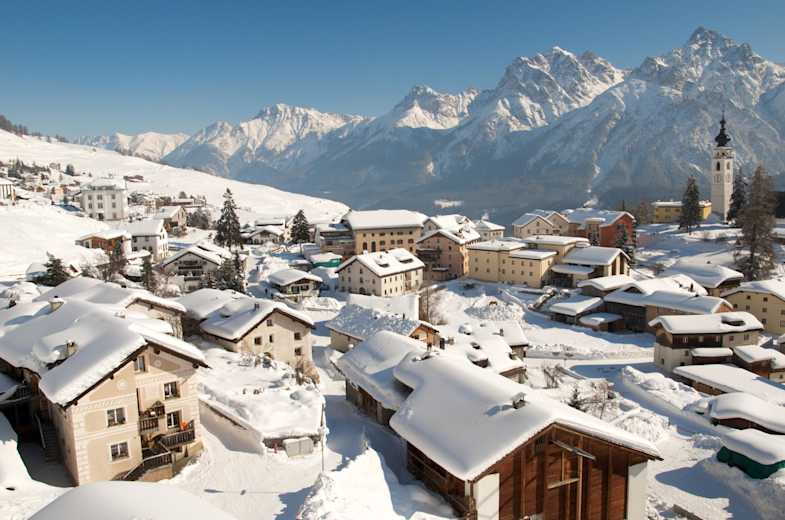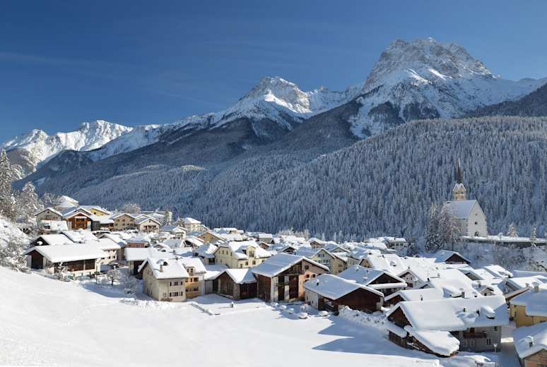 Blick über das verschneite Dorf Ftan Foto: Dominik Täuber, Tourismus Engadin Scuol Samnaun Val Müstair AG