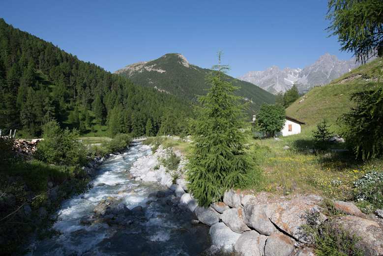Der Weg führt entlang des Flusses Aval S-charl Foto: Dominik Täuber, Tourismus Engadin Scuol Samnaun Val Müstair AG Bildergalerie (4)