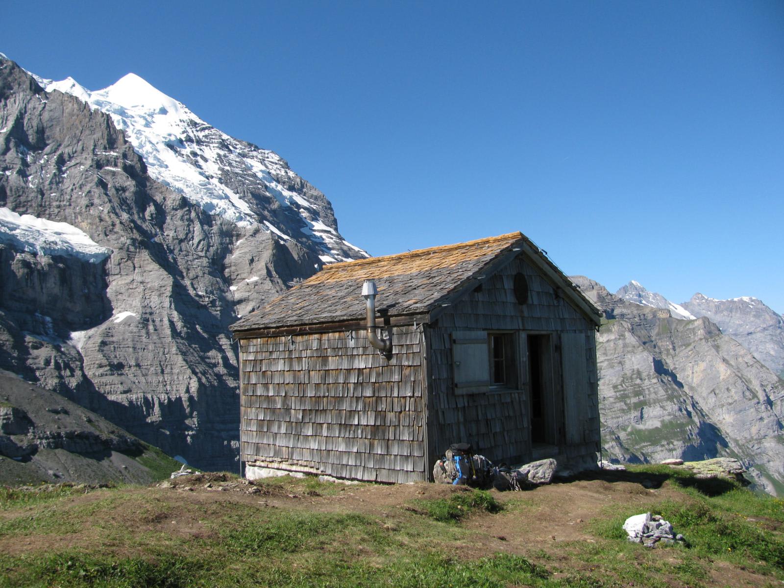 Man wandert vorbei an der alten Mittellegi-Berghütte, die sich früher am Nordostgrat des Eigers befand. Schaut man in die Hütte, lässt sich erahnen, wie karg das Leben der alpinistischen Pionierzeit gewesen sein muss.