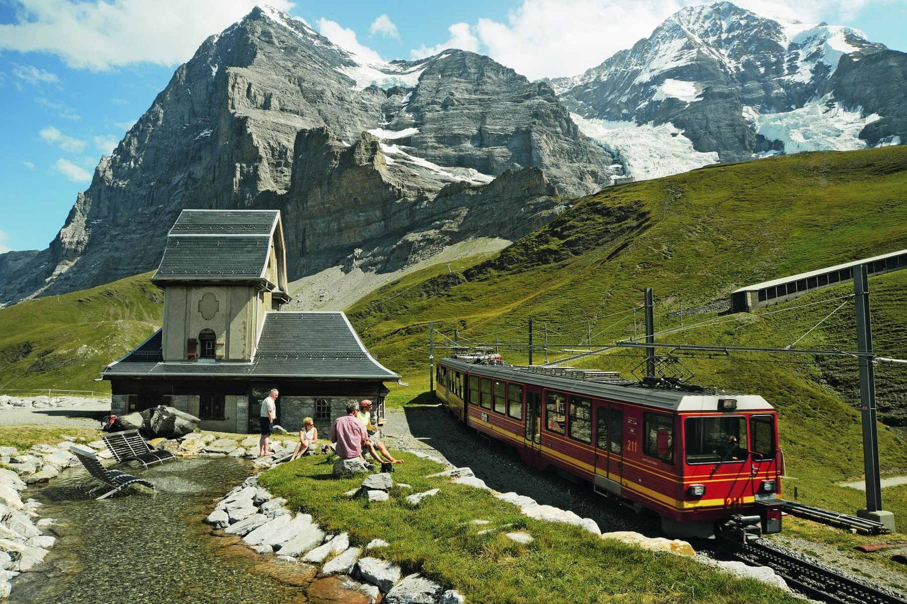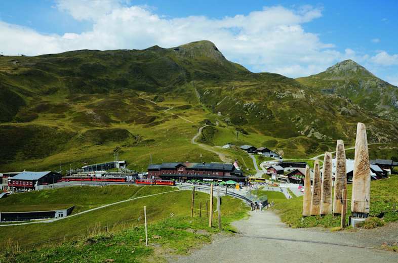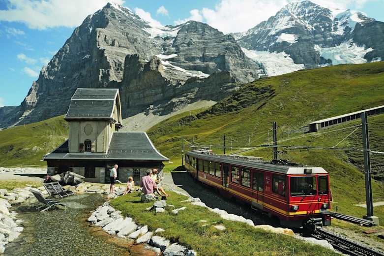 An diesem beliebten Ausflugsziel in der Jungfrau-Region im Berner Oberland treffen zwei Zahnradbahnen aufeinander und lassen Eisenbahnfreunden das Herz schneller schlagen.