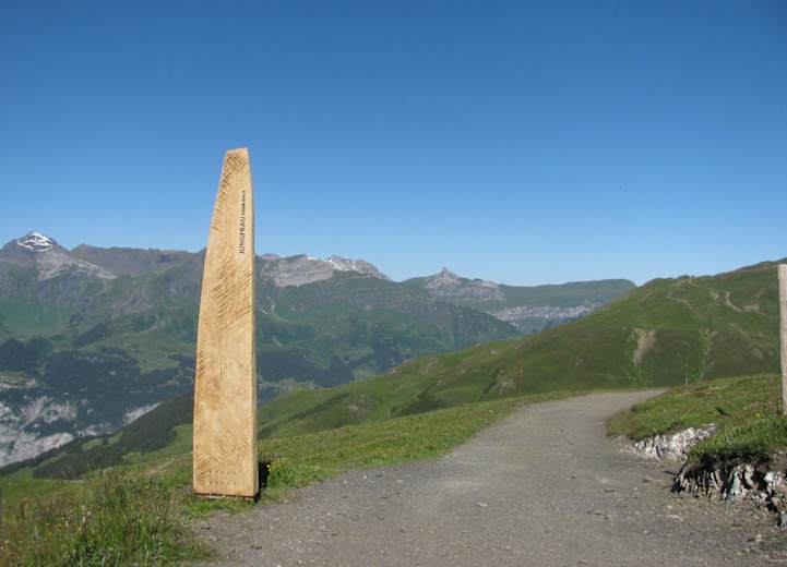 Holzstelen markieren den Jungfrau-Eiger-Walk Foto: Interlaken Tourismus