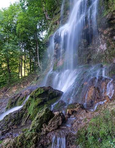 Dem Ebersteinburg-Rundweg folgend, erreicht man in Richtung Verbrannter Fels die Wolfsschlucht, in der es angenehm kühl ist und Moose und Farne die Steine überziehen.