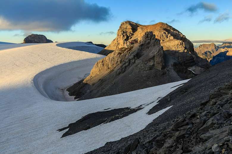 Hochalpine Bergtour im Kanton Glarus in der Zentralschweiz: Der Normalzustieg zur Planurahütte (2.947 m) ist eine hochalpine Wanderung über einen ausgedehnten, imposanten Gletscher, der nur am Seil zu begehen ist. Ausgangspunkt ist der Klausenpass (1.952 m), von wo man in rund vier Stunden die traumhaft im Zentrum der Glarner Alpen gelegene Schutzhütte erreicht.
