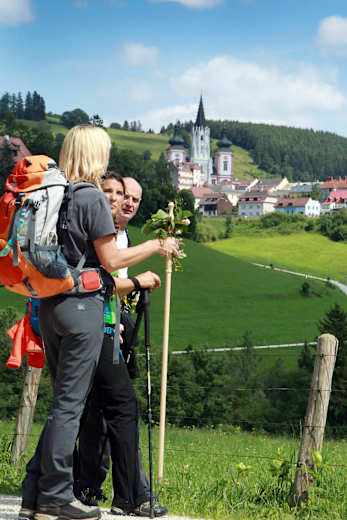 Nach rund 30 Minuten nach der Bruder-Klaus-Kirche zweigt die schönste Wegvariante aus dem Waltsertal ab. Über den mäßig steilen Anstieg zum Habertheuersattel gelangt man zum Sebastianiweg, auf dem man direkt zur Mariazeller Gnadenkirche gelangt. Damit hat man das Ziel des Wiener Wallfahrerweges erreicht.