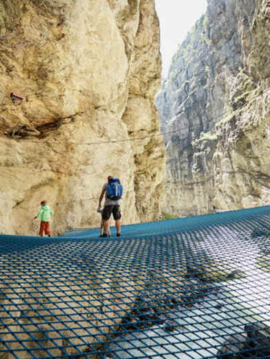 In der Gletscherschlucht wird Hochspannung pur geboten: Mutige können auf dem blauen „Spiderweb", einer Netzkonstruktion, über dem Abgrund klettern und hüpfen.