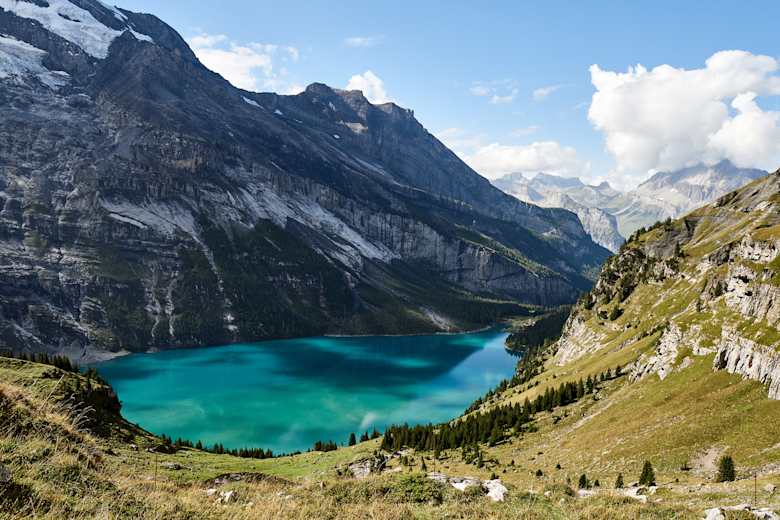 Der Weg folgt zuerst dem nördlichen Ufer des Oeschinensees Richtung Blüemlisalphütte. Das ganze Panorama liegt vor einem. Sobald man die Alp Underbärgli erreicht hat, biegt man südwärts ab und gelangt über den Wegpunkt 1.843 m zur Fründenschnur.