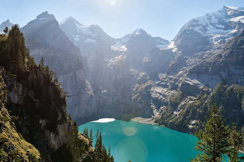 Ab hier führt ein ausgesetzter, aber gut befestigter Weg einem Felsband entlang. Dabei genießt man stets den Tiefblick ins einmalig schöne Blau des Oeschinensees.