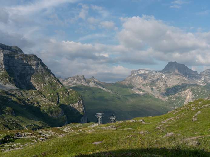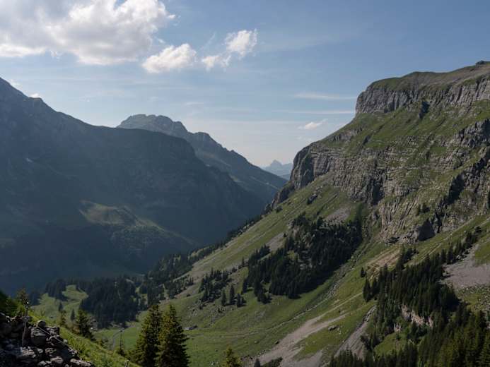 Der Blick wird frei auf die Alp Milchbüelen und voraus auf die mächtige Felswand zur Glattalp mit der gleichnamigen Glattalphütte auf 1.896 m, dem Ziel des Hüttenaufstiegs.