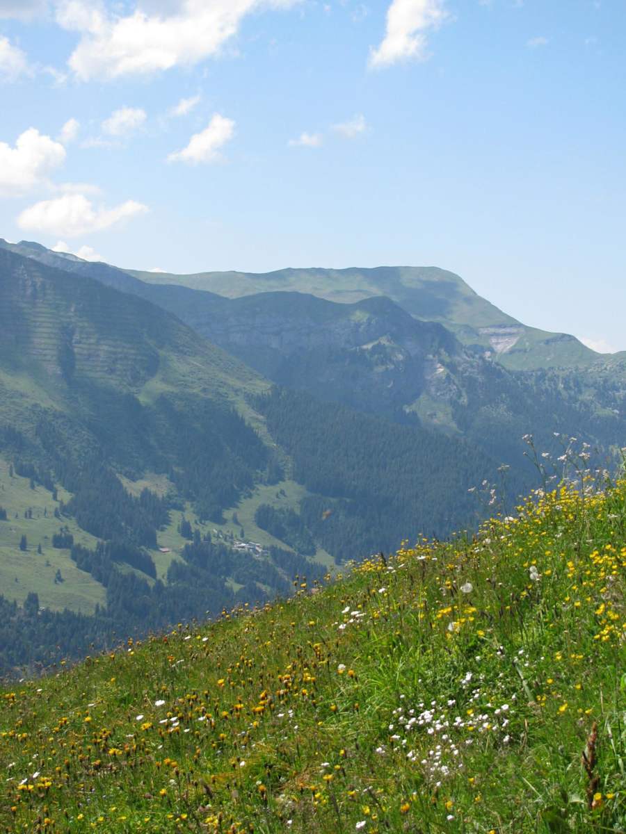 Zu Beginn geht es auf schmalen Pfad über Bergweiden bergab. Zunächst wandert man mehr oder weniger entlang dem Trassee der Wixi-Sesselbahn, dann schwenkt man nach 300 m westwärts ab.