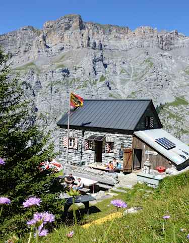 Zur Freude der Kletterer wächst wenige Meter neben der Hütte der Felskamm der Dri Horlini aus dem Geröll. Dort warten ein gutes Dutzend Sportklettereien in der Südost-Wand und die Traverse von Westen nach Osten - die Paradetour an den Dri Horlini.