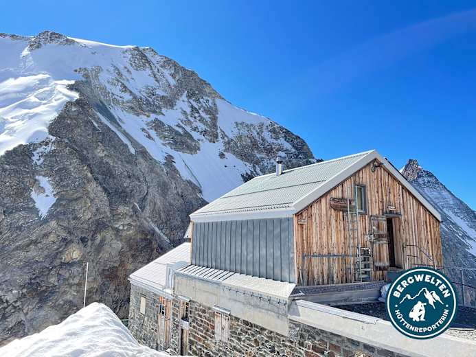Wie ein Adlerhorst klebt die Hollandiahütte auf 3.234 m an den Felsen, die man wenig später erreicht.