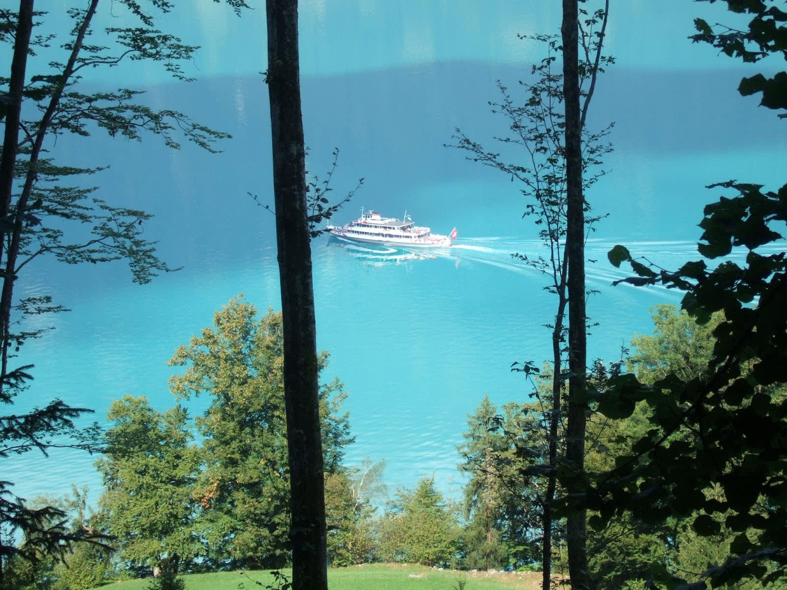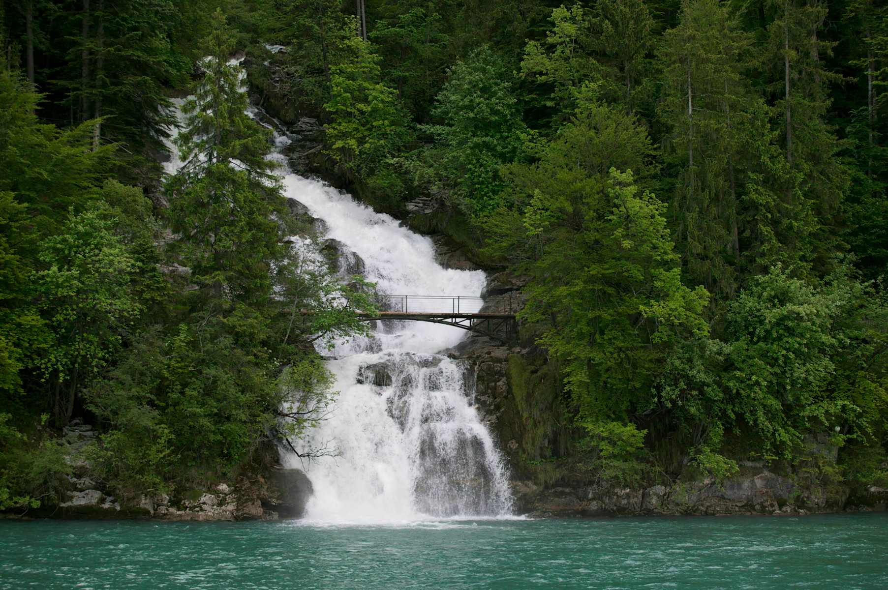 Links führt ein Wanderweg zum Mülibach und hinter den Wasserfall Mülibach oberhalb von Isetwald. Die Szenerie wechselt nun zwischen schönen Wäldern und offenen Feldern mit Blick auf den Brienzersee, bis die eindrücklichen Giessbachfälle auftauchen. Kaskadenähnlich stürzt das Wasser hier senkrecht in den türkisfarbenen See (Etappe 2).