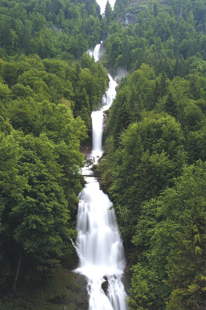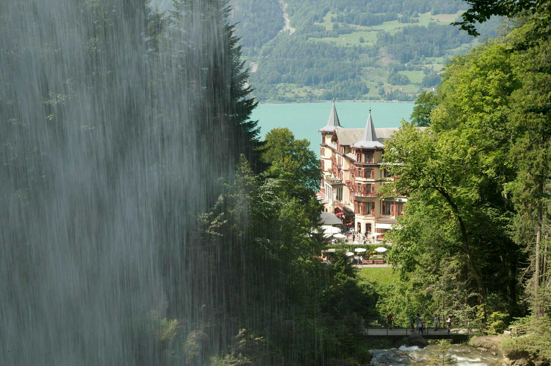 Das Grand Hotel Giessbach thront über dem Brienzersee. Foto: Interlaken Tourismus Der lichtdurchflutete Wasserfall Erschwandenbach. Foto: Interlaken Tourismus