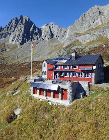 Die Hütte liegt auf einem schönen Plateau über dem Göscheneralpsee. Nahe der Hütte liegt der tiefblaue Bergsee mit Felsinselchen, der an heißen Tagen zur Abkühlung animiert.