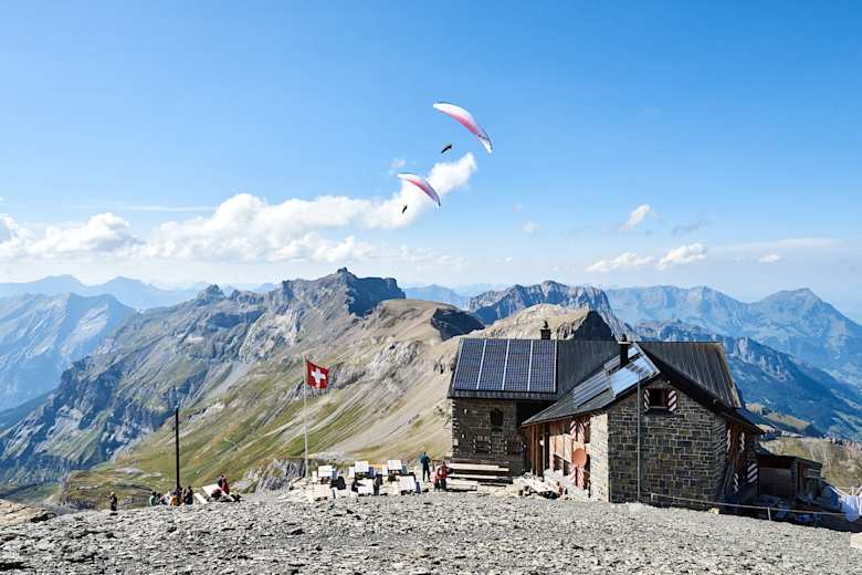 Die Hütte liegt auf 2.834 Meter Höhe, darüber ist aber noch viel Platz für ein paar schöne Flugmanöver mit den GleitschirmenFoto: Raffael Waldner, Bergwelten Schweiz 04/2019