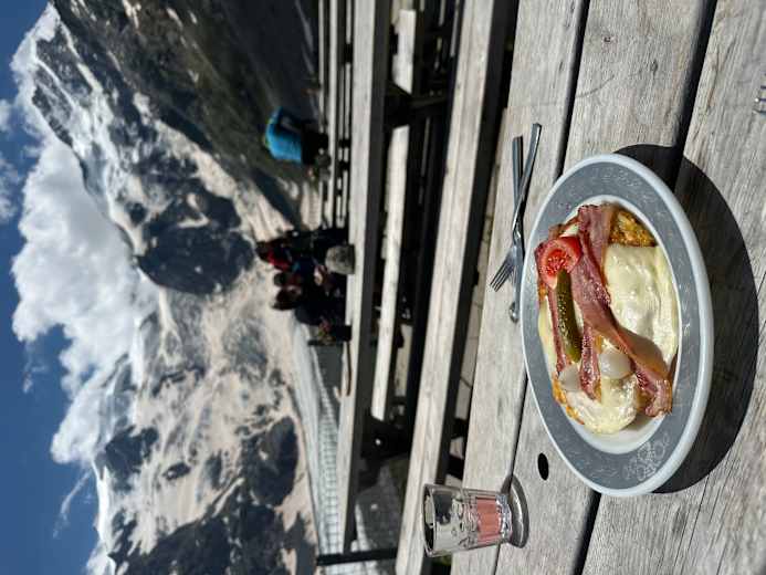 Achtung Kletterfans: es gibt einen eigenen Klettergarten rund um die Hütte sowie eine einfache 7 Seillängen lange Tour auf den Corn da Boval. Auf der Hütte kann man mit Kreditkarte zahlen, allerdings mit ein paar Prozent Kommission.